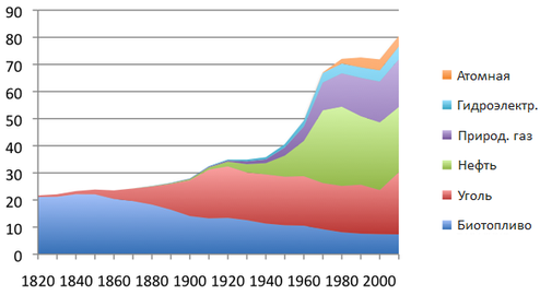 Электрификация послужила причиной большей части роста в 1900-1950 гг. Нефть позволила случиться послевоенному экономическому буму в 1950-1970 гг. А природный газ способствовал росту в 1970-1995 гг. Рост после 2000 года, к сожалению, связан в основном с повышением потребления угля в Азии.