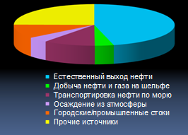 Например, из нефти, ежегодно попадающей в мировой океан, только 4% связано с геологоразведочными и буровыми работами. Почти половина попадает в океан в связи c естественными процессами, за счет естественного выхода нефти на поверхность.